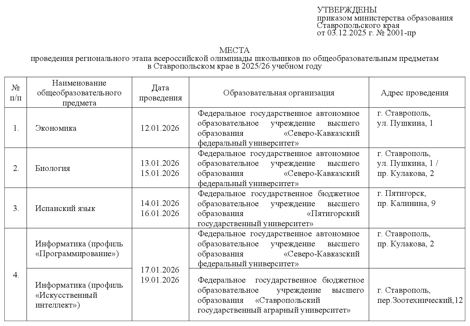 скачать Приказ Министерства образования Ставропольского края от 03 декабря 2025 года №2001-пр "О местах проведения регионального этапа всероссийской олимпиады школьников по общеобразовательным предметам в 2025/26 учебном году"