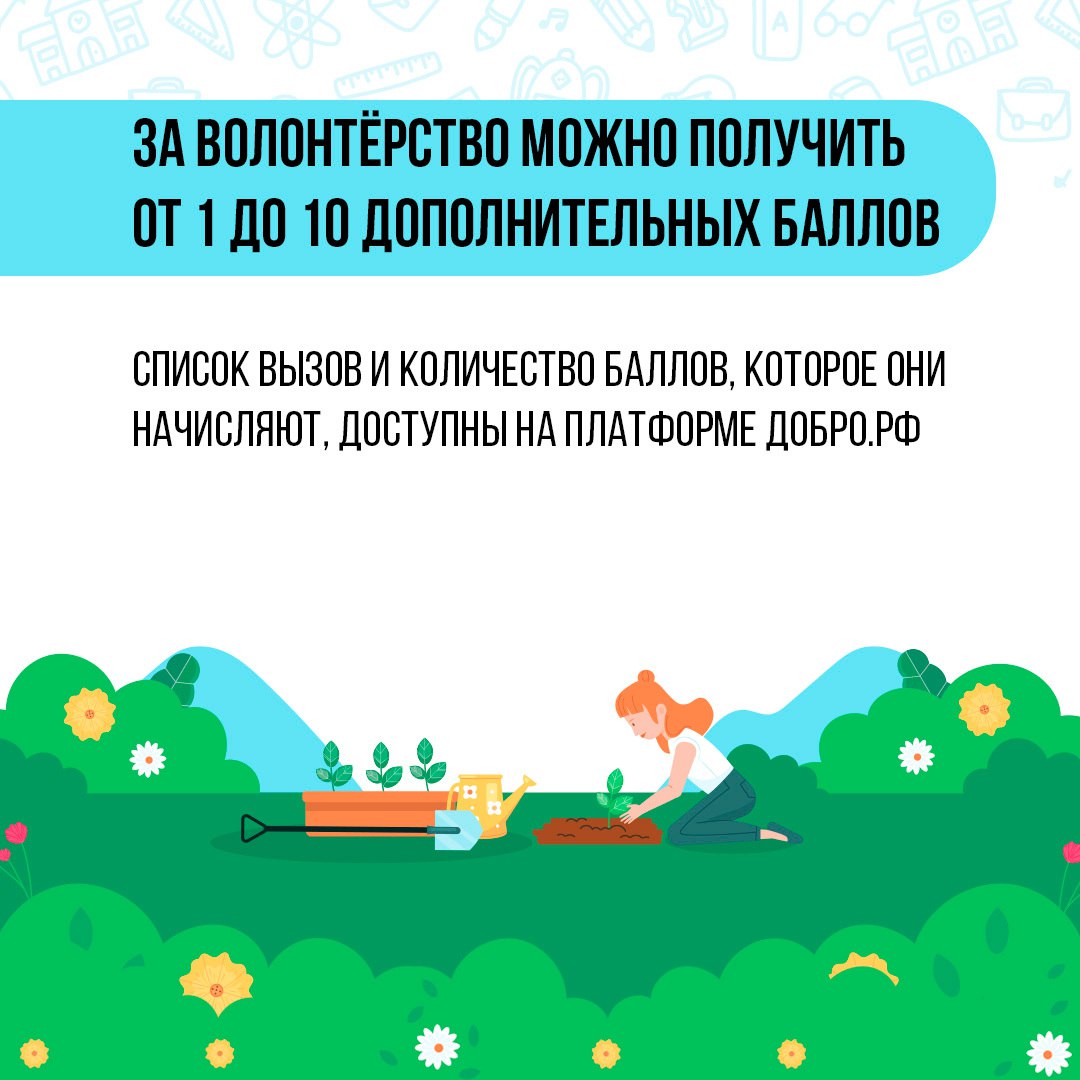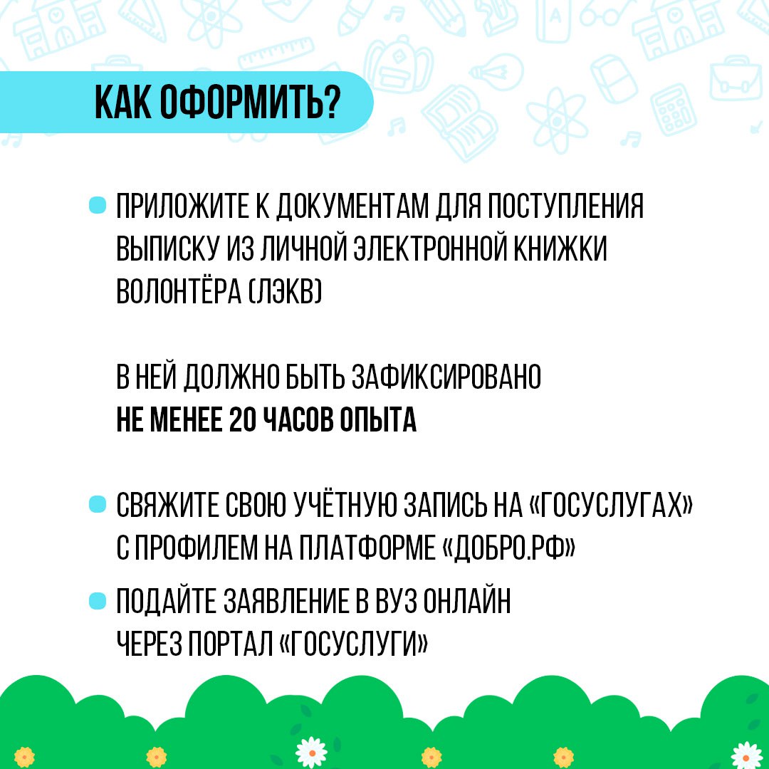 Для того, чтобы баллы копились, надо иметь подтверждённую учётную запись на «Госуслугах» и на платформе «Добро.рф», а также личную электронную книжку волонтёра. В ней должно быть собрано не менее 20 часов полезных дел. Выписку из этой книжки надо будет приложить к документам, подаваемым в учебное заведение
